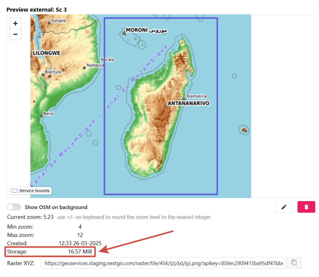 My API keys are used for integration with other NextGIS services and external applications. For instance, you’ll need an API key to work In this section Administrator can create and delete API keys.
