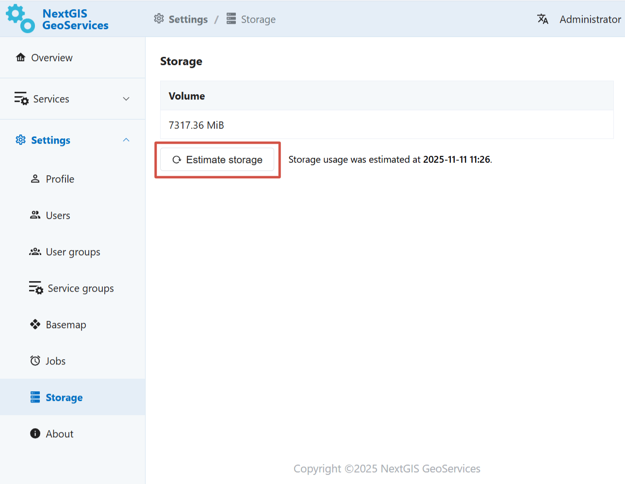 To start estimation process, click Estimate storage. Beside this button you’ll see the date and time of the last estimation.