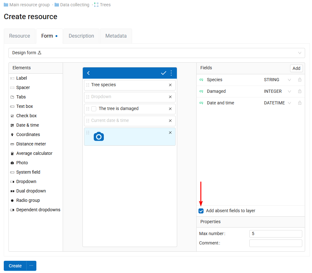 Now that we added all the elements we need to add the corresponding fields to the layer. Activate the checkbox Add absent fields to layer. This is the final look of the form: