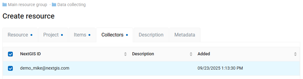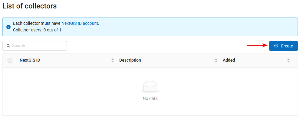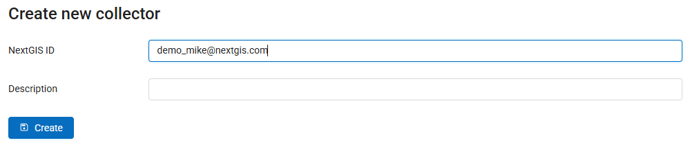 Click the Create button to add a user to the list of collectors. First, add yourself. In the NextGIS ID field enter your email used for the registration on my.nextgis.com.