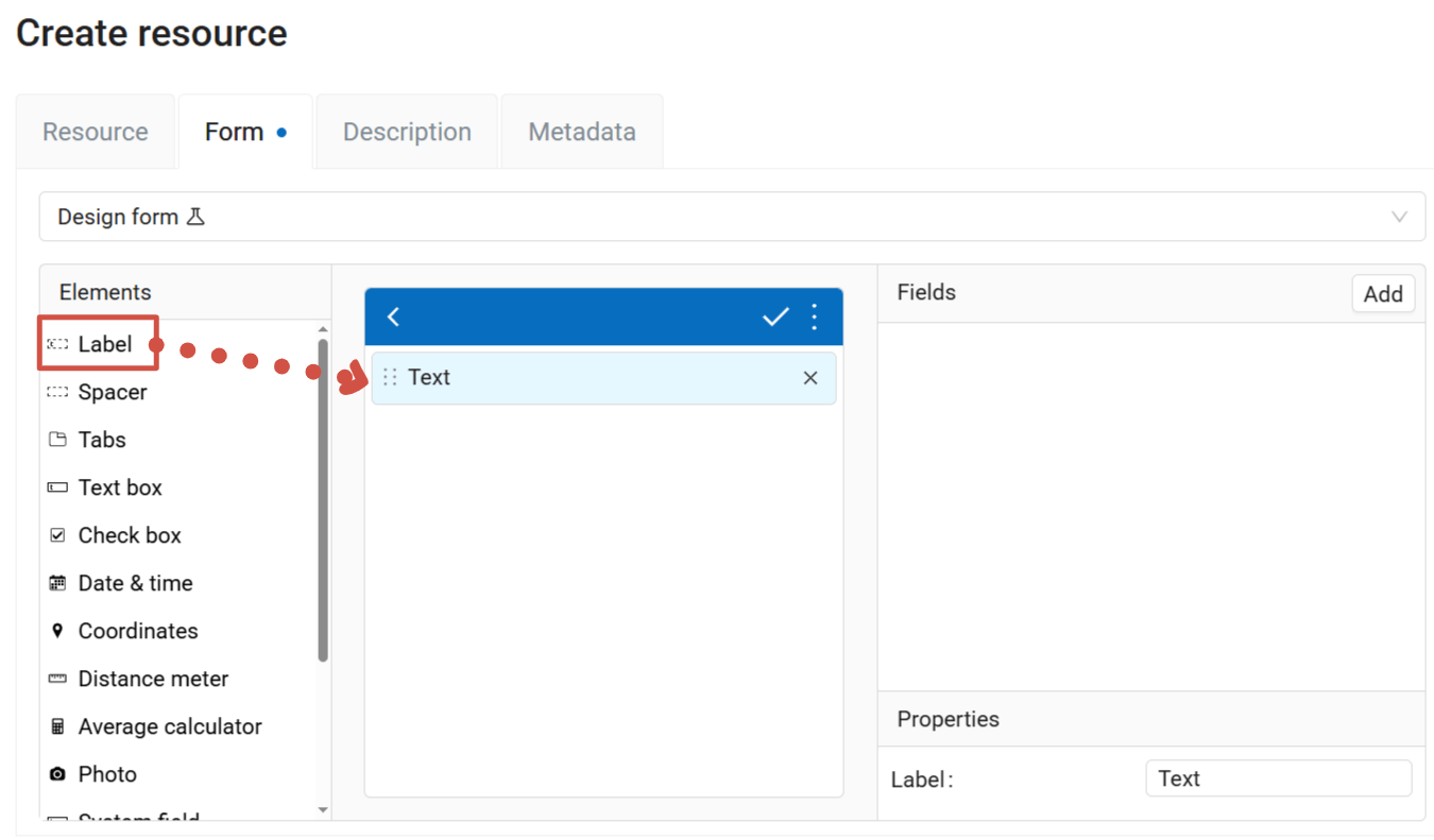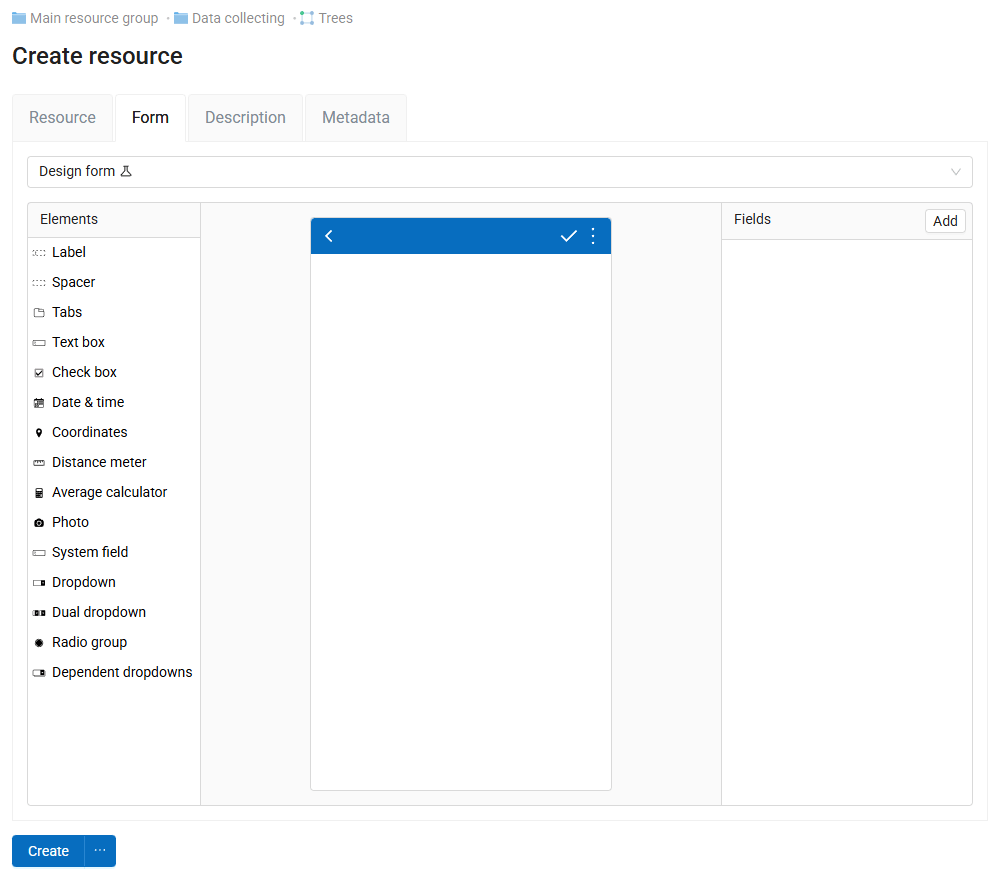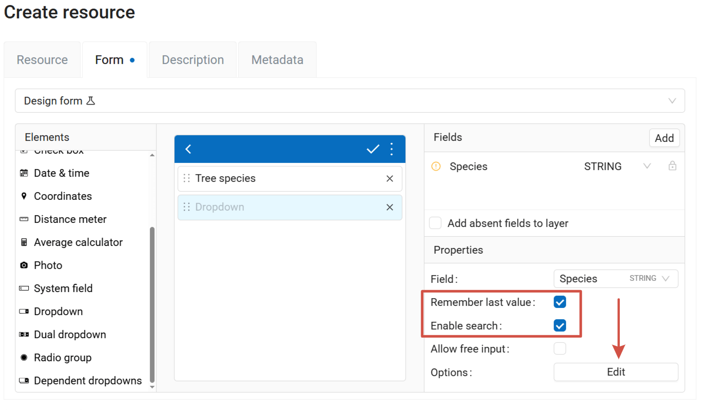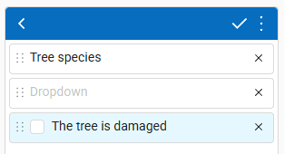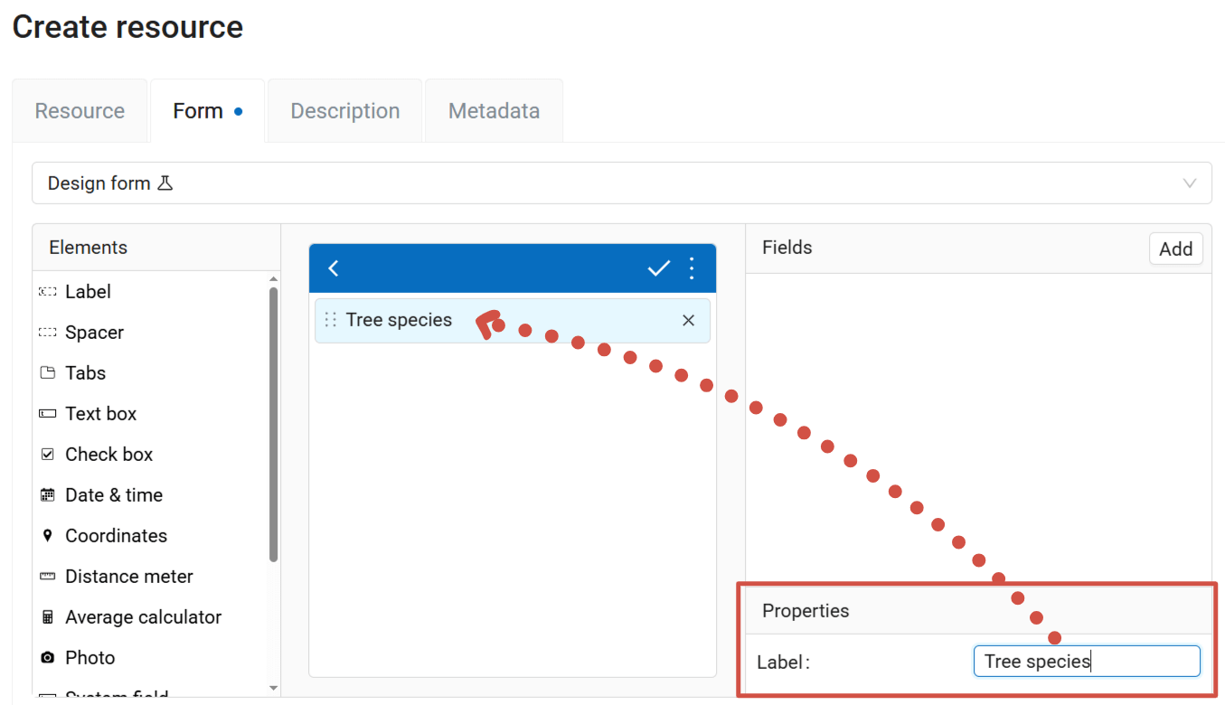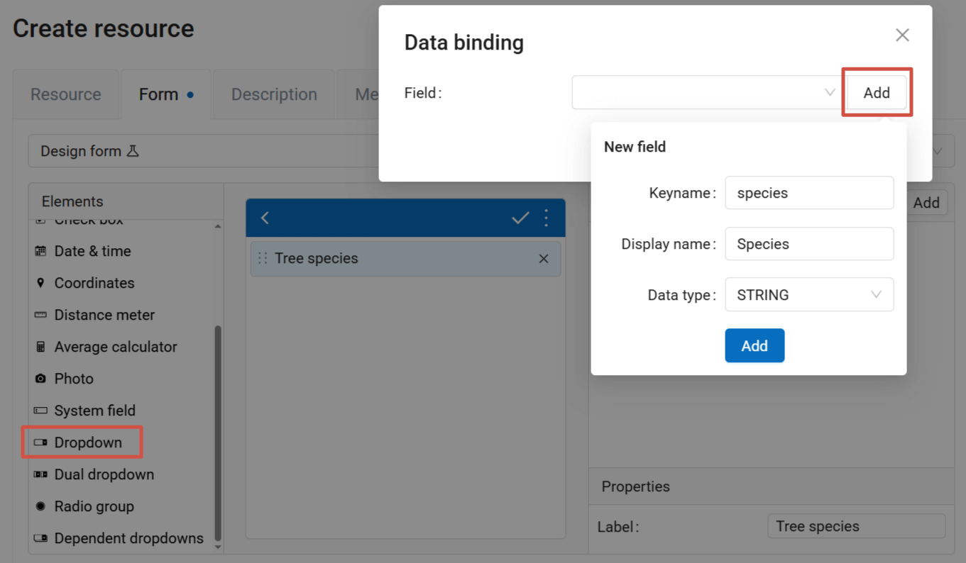 Now we need to add the field where collectors enter the data. For this first field we’ll provide the collectors with a predetermined list of tree species.Select the element Dropdown and drag it to the layout.