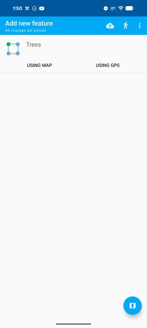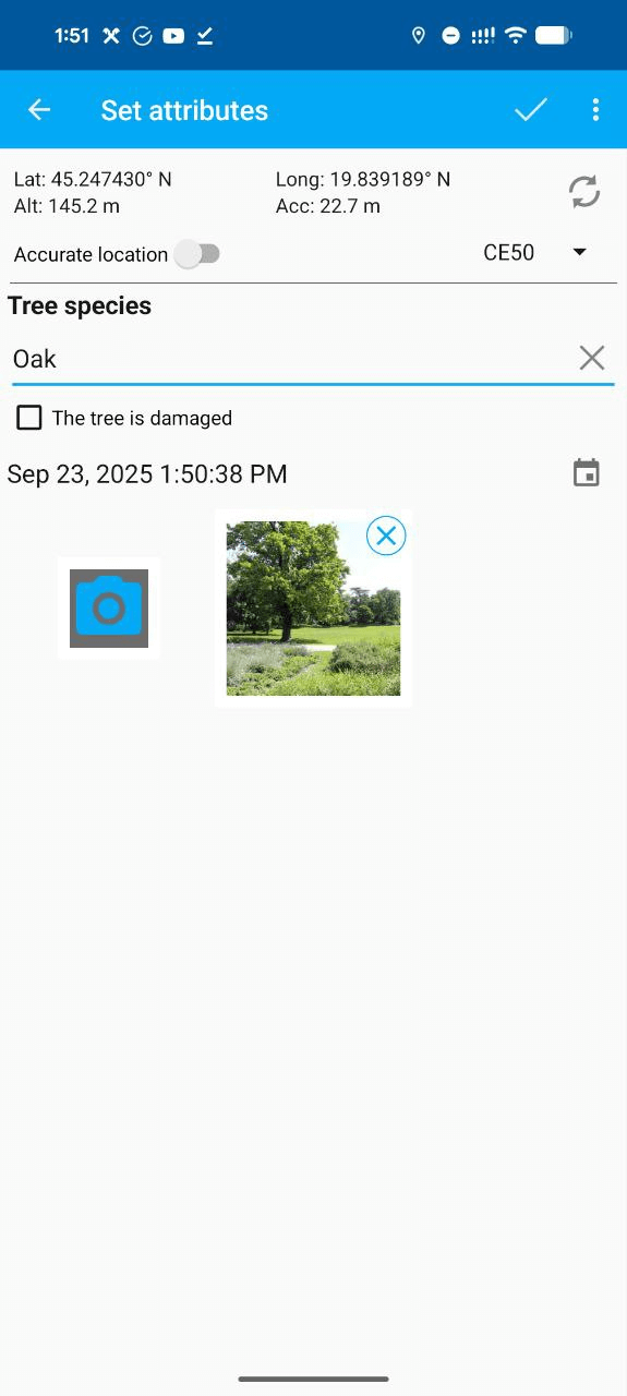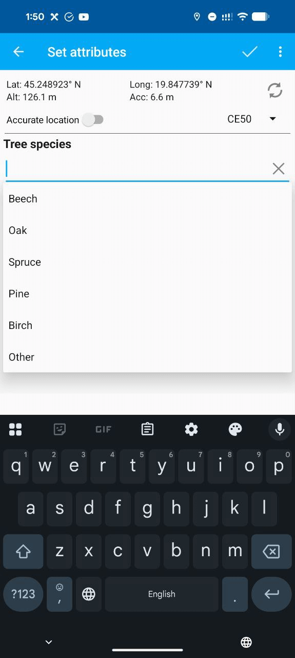 Go to the nearest tree and click USING GPS - it records the current GPS coordinates of your mobile phone and opens the form to enter the other information.