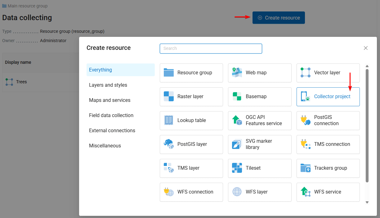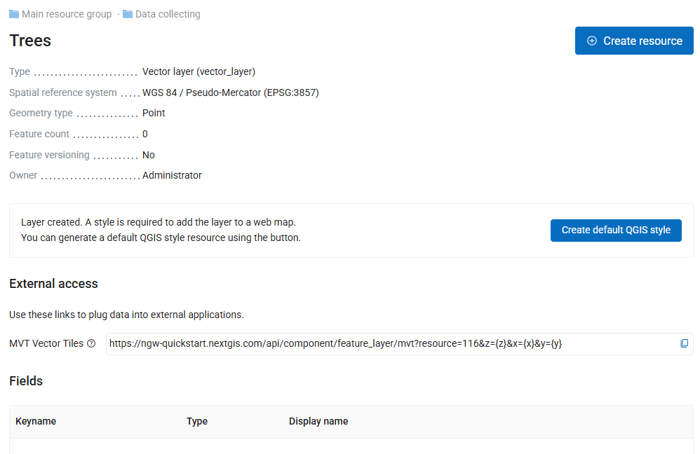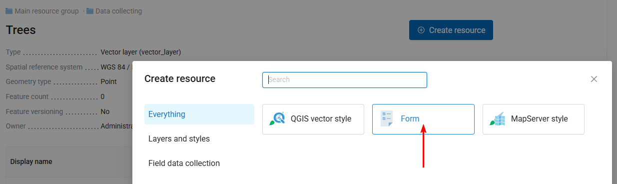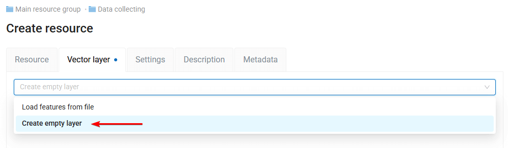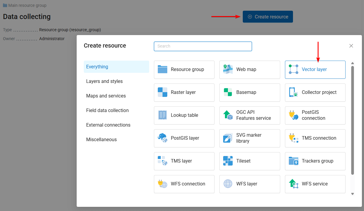 Next we need to create a vector layer, it will serve as a database where the collected information about geographical objects would be stored. Click the Create resource button, then select Vector layer.