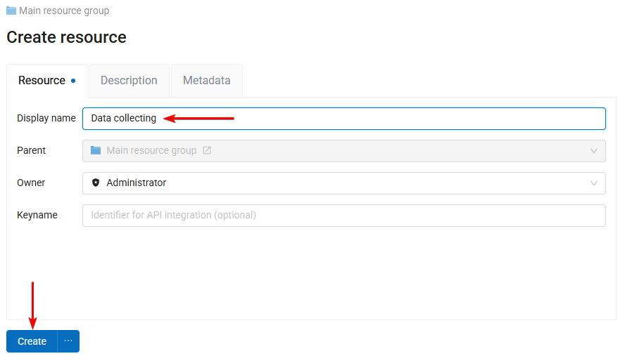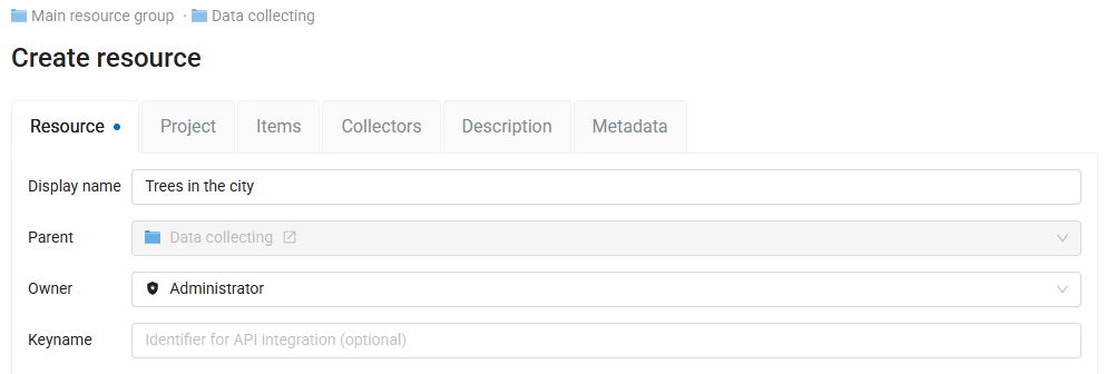 The resource creation window consists of several tabs, in this case we need to set only the name Data collecting