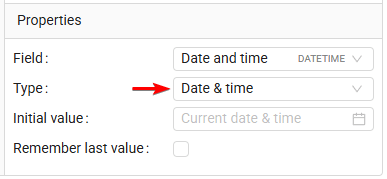 Click on the Dropdown element and in the Properties block activate Remember last value and Enable search checkboxes.