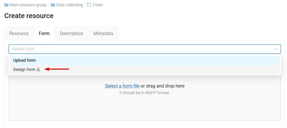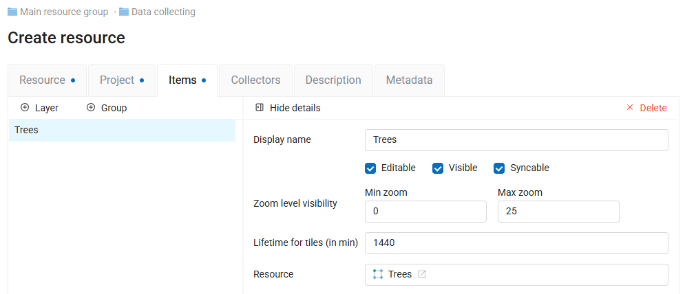 On the Resource tab set the name of the project that the data collectors would see in the app. Enter Trees in the city