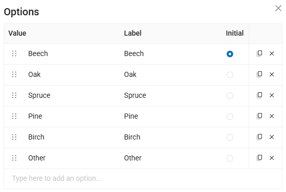 Enter six options: Beech, Oak, Spruce, Pine, Birch, Other