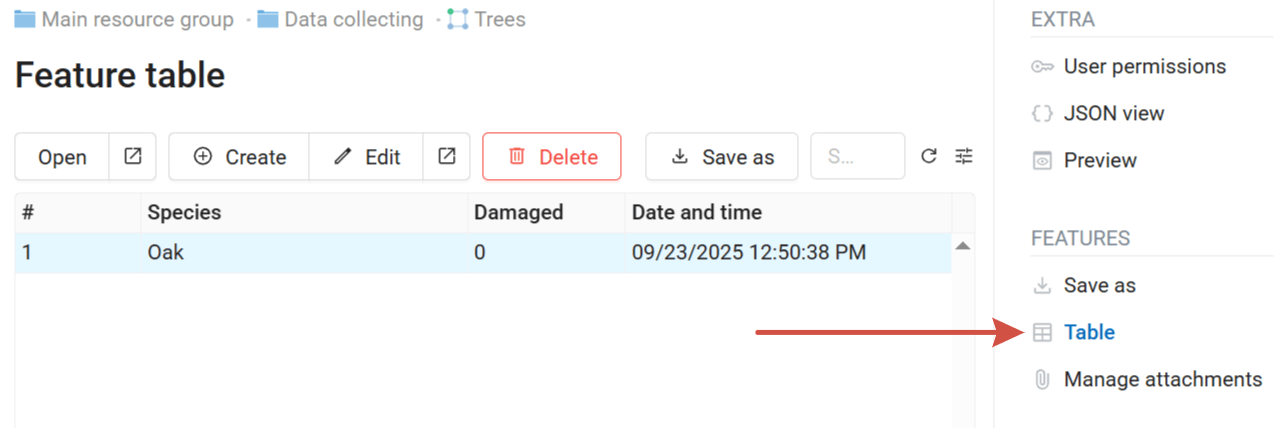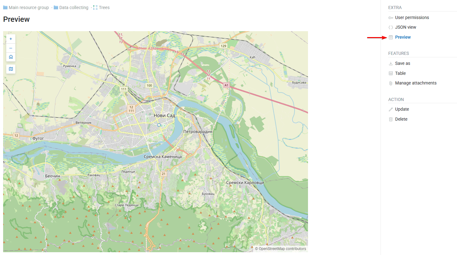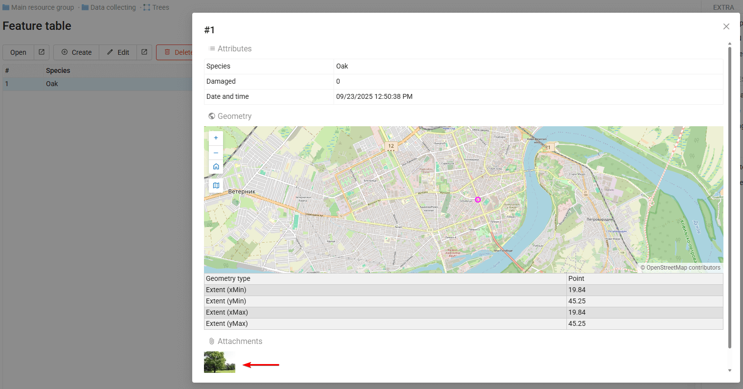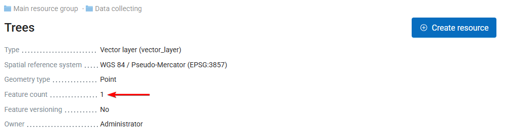 Return to Web GIS and open the Trees vector layer resource. In its metadata you can see that the feature count has changed. It’s synchronized as the collected data’s been uploaded to the cloud.