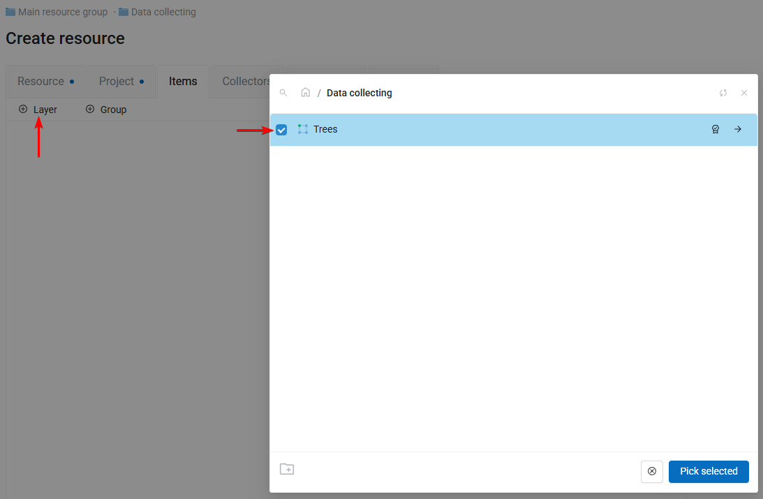 On the Items tab determine the contents of yur project. Which data should the field workers gather? Which layer should they see as a reference on the map? Click + Layer button and select Trees