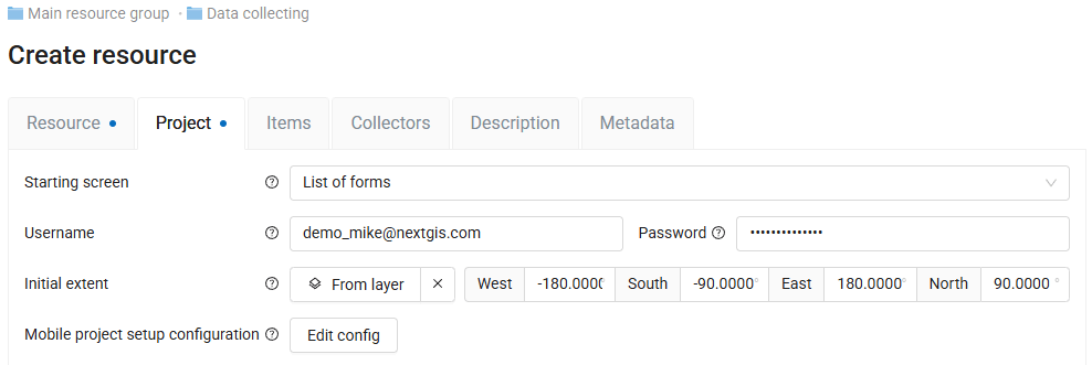On the Project tab enter the username and password of Web GIS administrator, use your own credentials - the email you used to create NextGIS ID and its password.