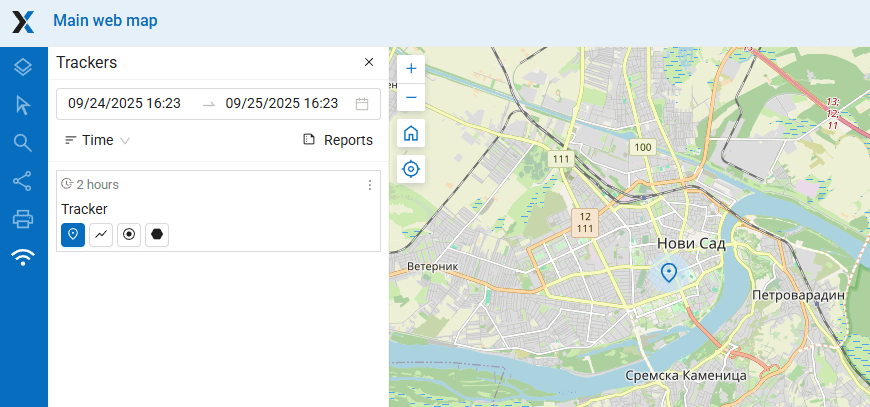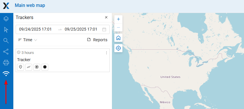 This Web Map is empty - no layers, just a default basemap. But in the left panel a Trackers menu is available, activate it.
