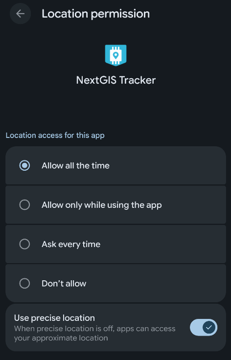 Go to your device Settings and select “Allow all the time” for the Tracker app. The dialog may vary depending on Android version.