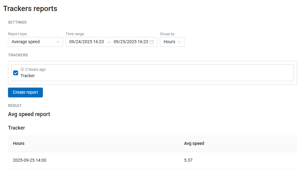 In the “Report type” dropdown menu select Average speed. Then set the time range covering your today’s walk. In the “Group by” field select grouping by hours.