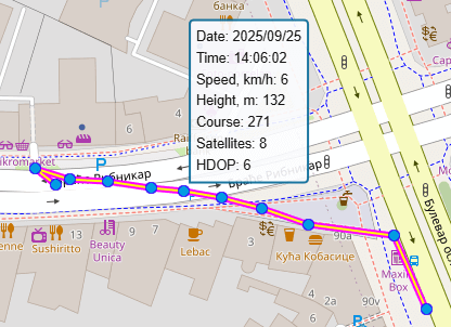 Hover over track points to see detailed information on the date, time, speed, direction and other parameters.