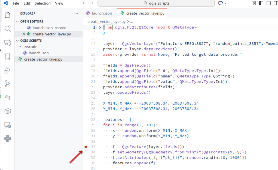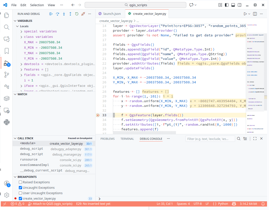 That’s why we built a tool to bridge the gap. QGIS DevTools is a QGIS plugin that enables smooth integration with Visual Studio Code, one of the most widely used and feature-rich development environments. With this plugin, developers can set breakpoints, inspect variables, and step through code directly from Visual Studio Code. Thanks to its modular architecture, the plugin can be extended to support other IDEs like PyCharm or Eclipse in the future, as well as additional development scenarios beyond debugging.