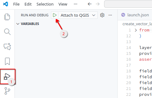 After that switch to the Run & Debug tab (Ctrl + Shift + D) and run Attach to QGIS.
