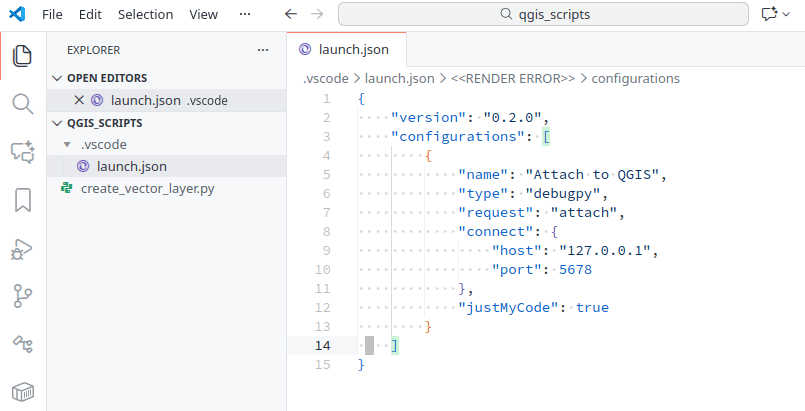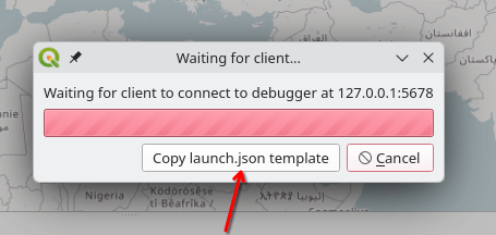 After that you will see the standard QGIS blue notification about started session, with Copy launch.json template button.