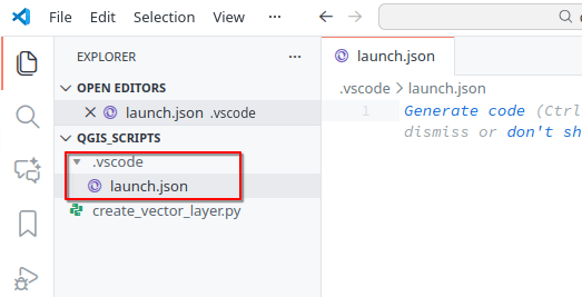 As the next step, return to VS Code and create a .vscode subdirectory in the script directory, then add an empty launch.json file inside it.