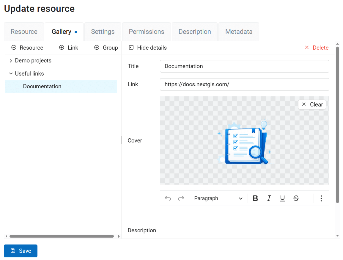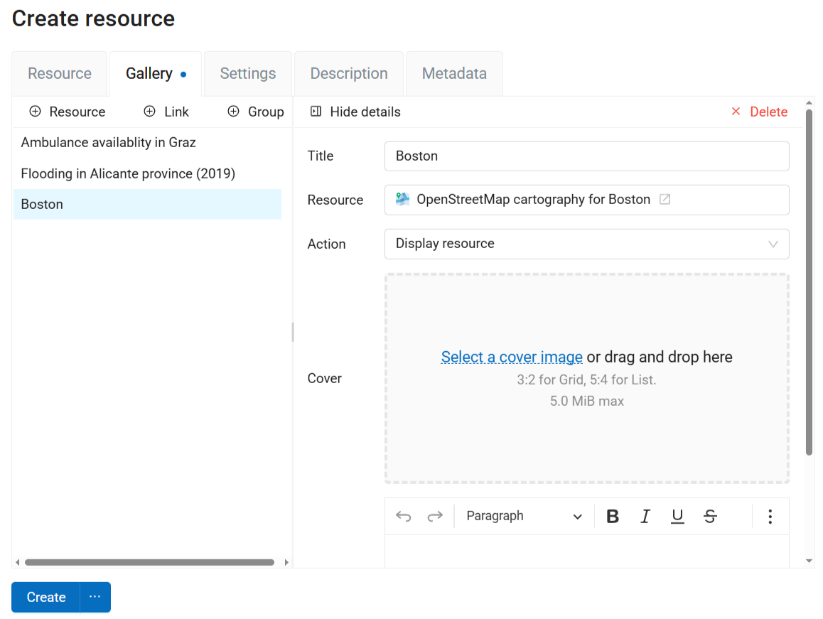 You can also add description and metadata on the corresponding tabs. Gallery description is displayed both on the resource page and in the gallery itself, below its title.