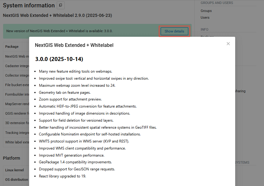 For NextGIS Web on-premise on the System information page you can check for available updates. If an update is available, you’ll see a message at the top of the page.