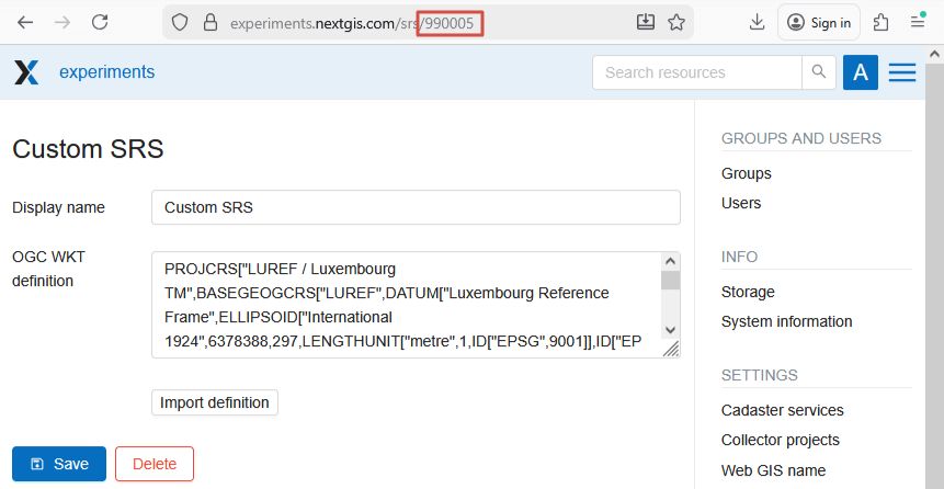 To extend API requests. Support for custom SRS is gradually added to NextGIS Web API too. For example, this request will return a feature in a required SRS (in example we use custom SRS identifier 990002)