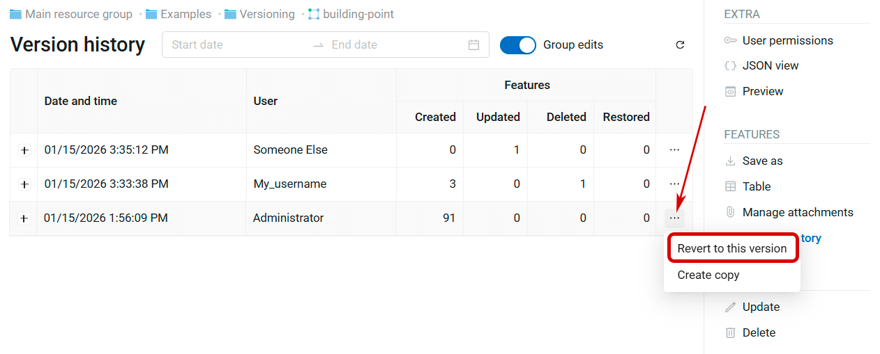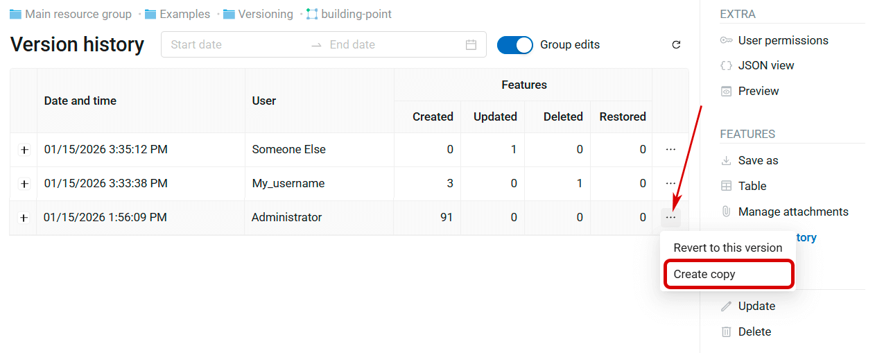 Versioning allows to undo the latest changes by reverting to an earlier version of the layer, or save a version of a layer recorded in its history as a separate resource.
