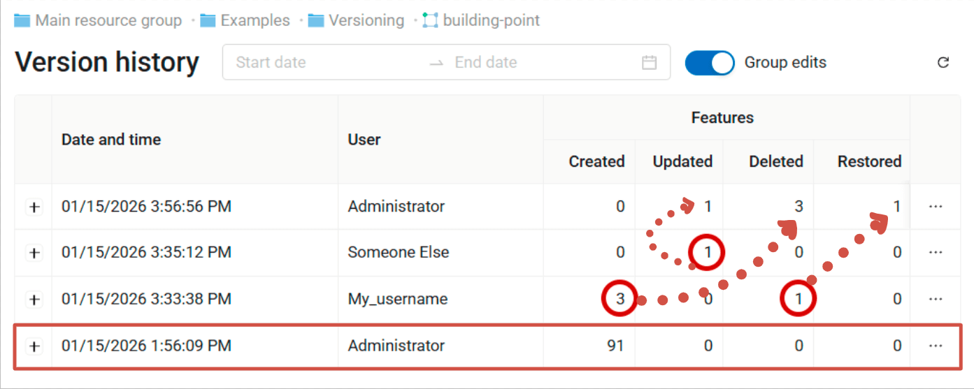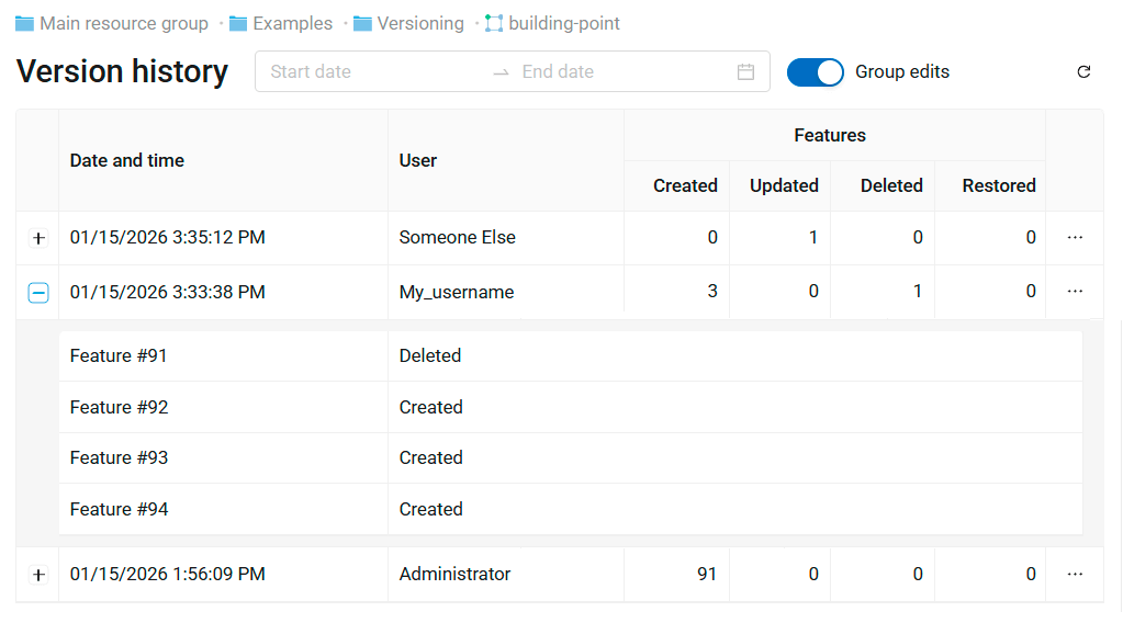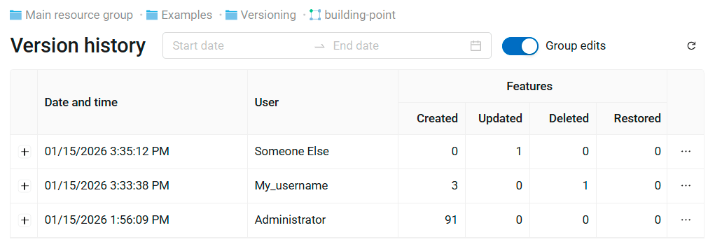 /api/resource/{id}you can get the information on the versioning status and the current version of the data in the general layer query (‘versioning’ property)./api/resource/{id}/feature/add layer version to get its state at a particular moment/api/resource/{id}/feature/changes/checkto get information about the difference between two given versions of the layer/api/resource/{id}/feature/version/{vid}get metadata for a given version