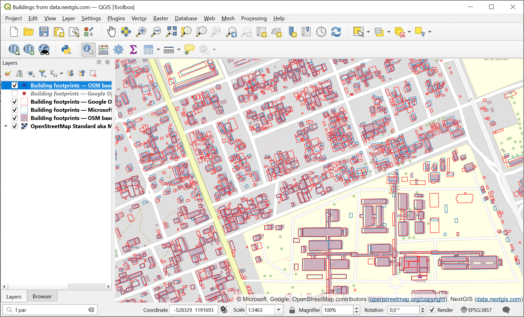 Pic. 3.46. Building footprints data from NextGIS Data in QGIS